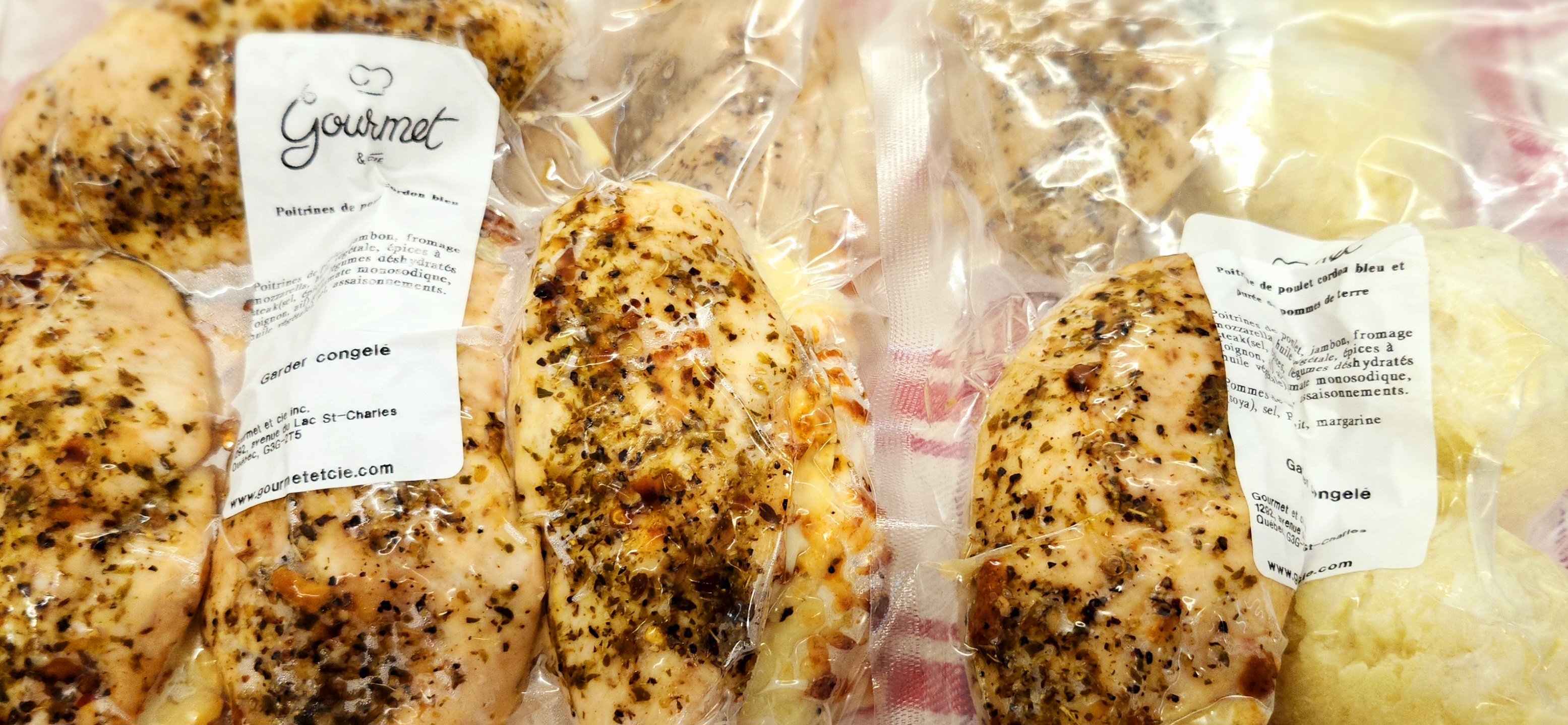 Poitrine de poulet, jambon, fromage cheddar, huile végétale, épices à steak(sel, épices, légumes déshydratés (oignon, ail) glutamate monosodique, huile végétale), sel, assaisonnements.