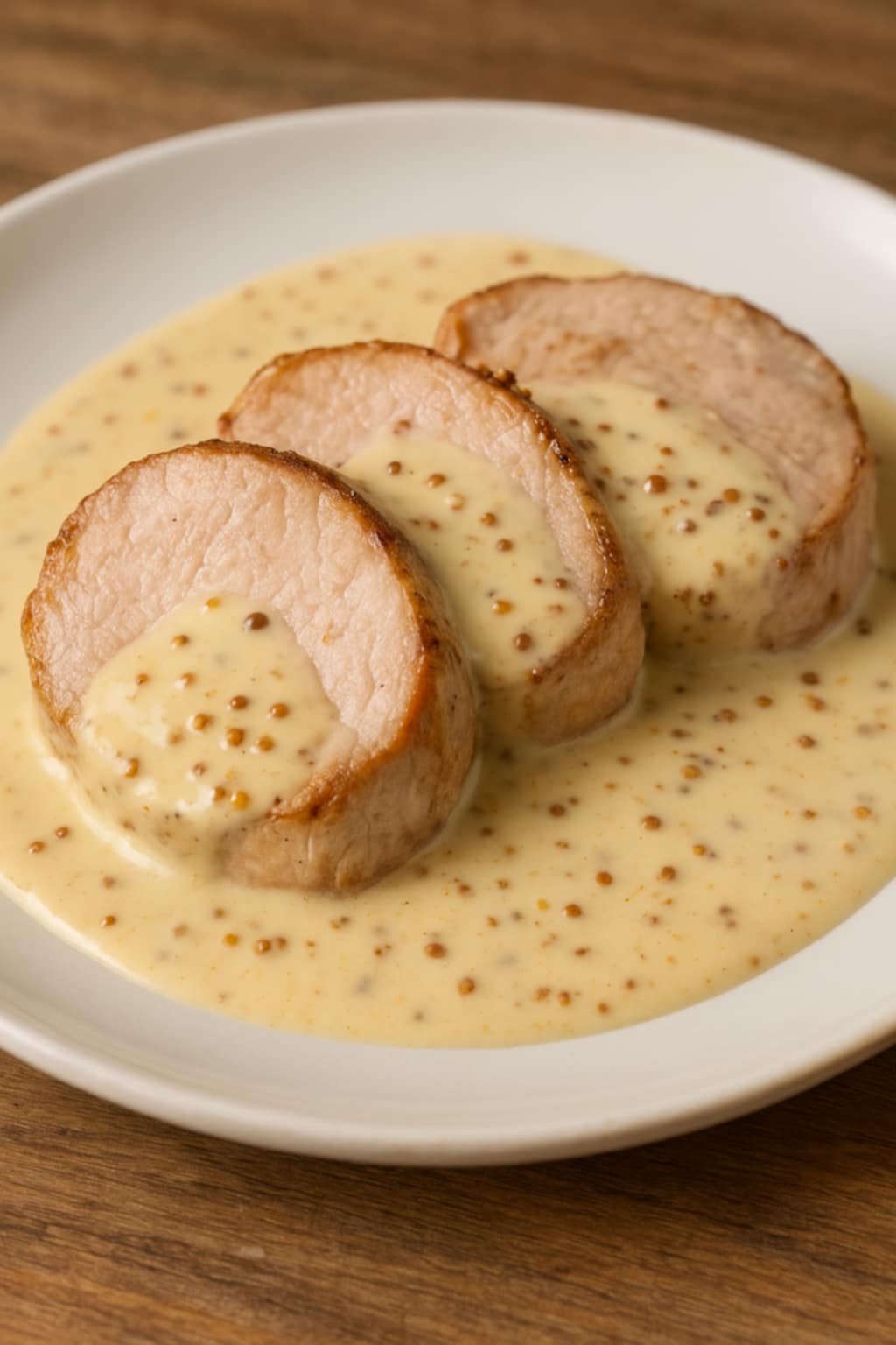 Des médaillons de filet de porc, dans une sauce faite de crème, moutarde de dijon et moutarde à l'ancienne.