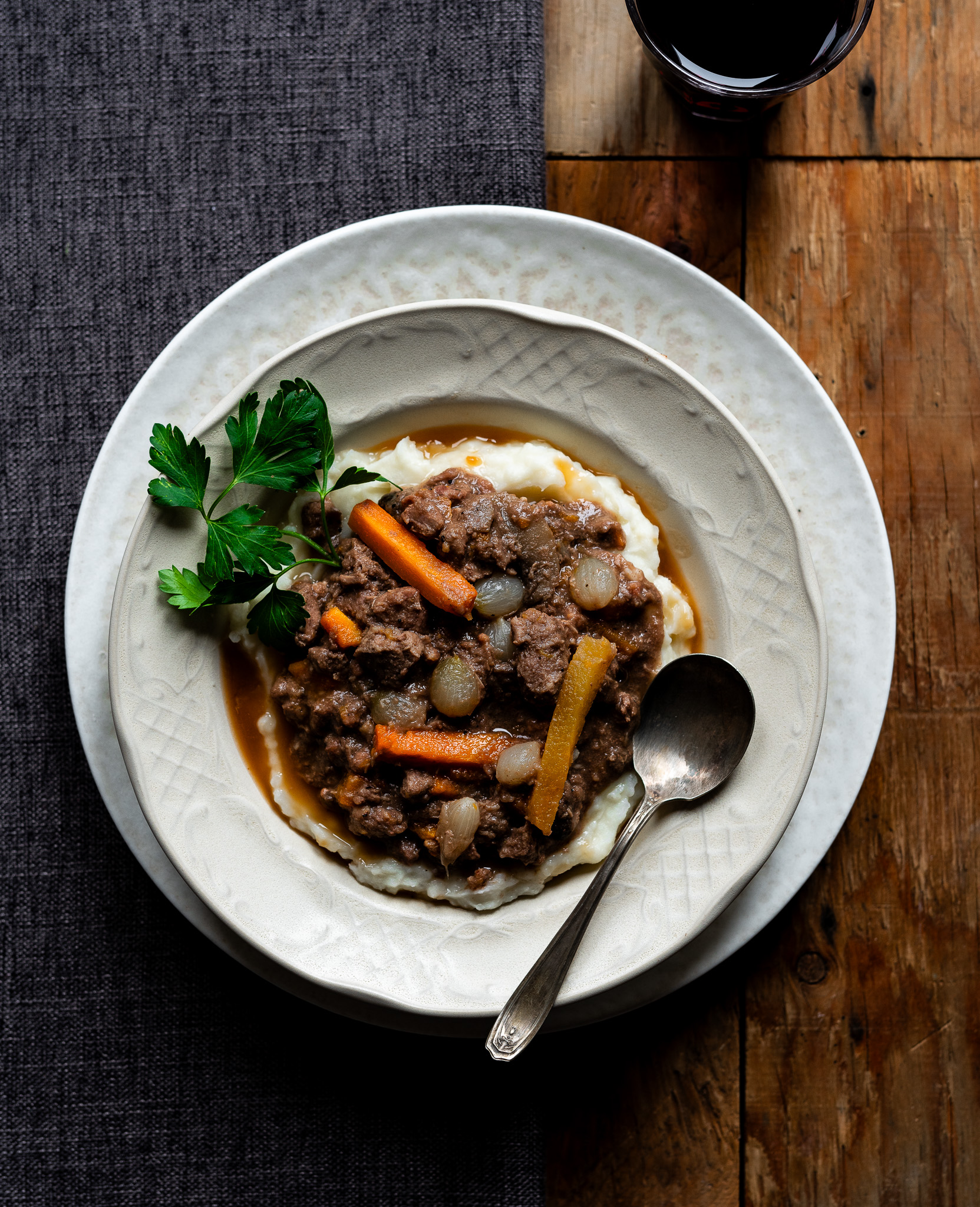 Ingrédients: Porc, carottes, oignons, champignons, bacon, vin rouge (sulfites), amidon de maïs, base de bœuf (gluten, blé), huile, sel, assaisonnements.