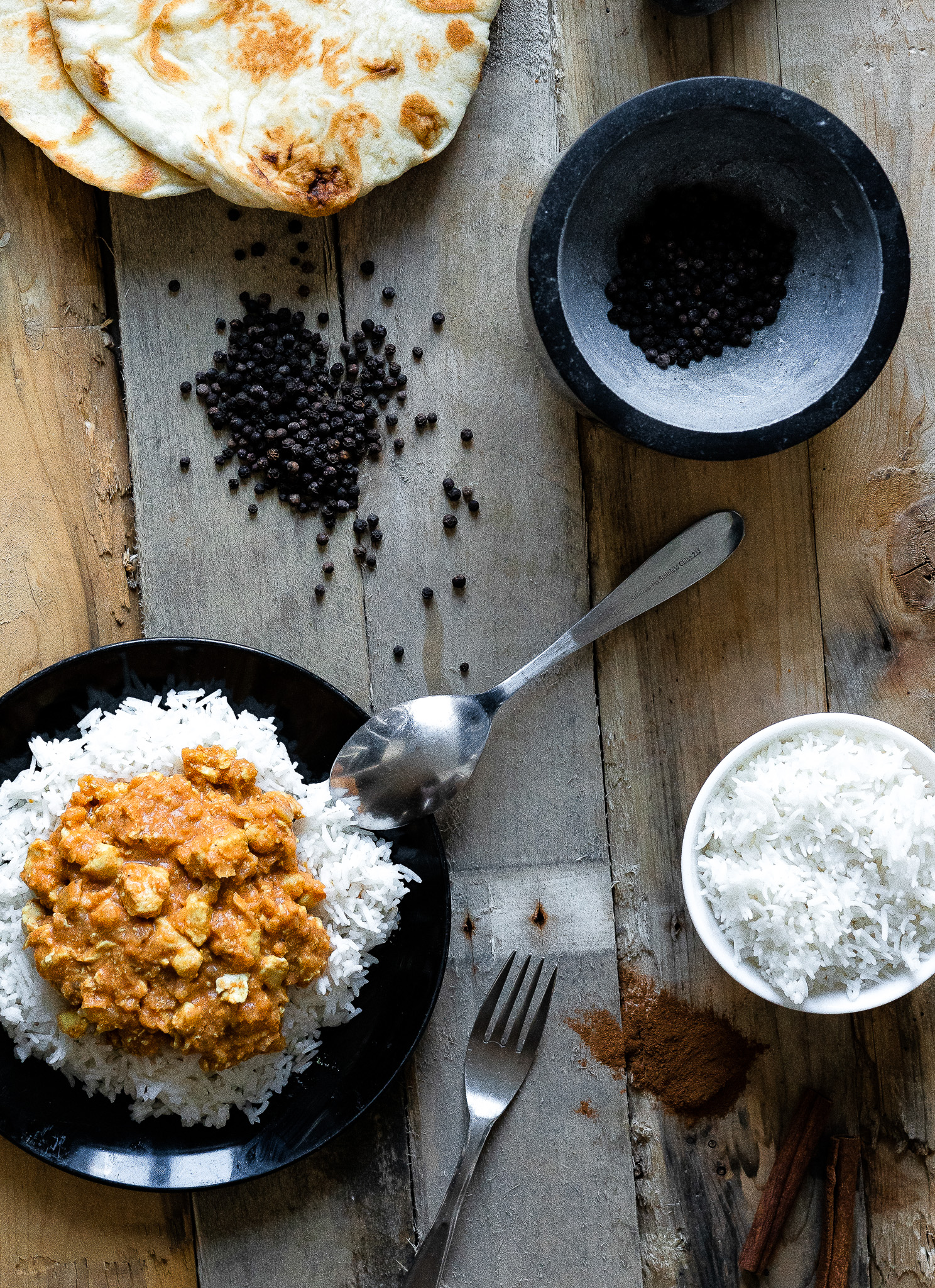 Des lanières de filets de poulet dans une sauce aux saveurs indiennes, faite à partir de lait de coco légèrement tomatée et relevée d'épices indiennes.